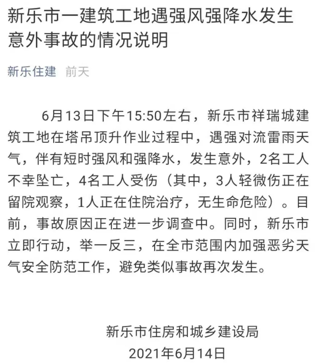 新樂住建消息,2021年6月13日下午15:50左右,石家莊新樂市祥瑞城建筑工地在塔吊頂升作業過程中,遇強對流雷雨天氣,2名工人不幸墜亡,4名工人受傷目前,事故原因正在進一步調查中。圖片