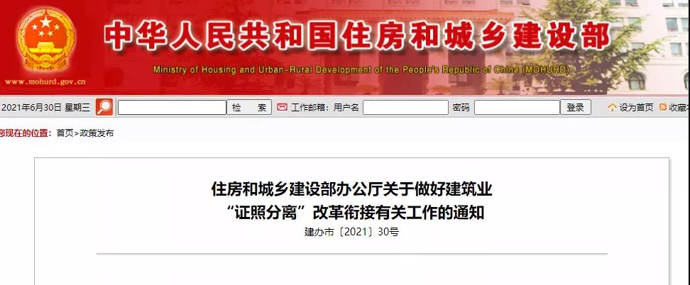 6月30日住建部發(fā)布《關(guān)于做好建筑業(yè)“證照分離”改革銜接有關(guān)工作的通知》:
