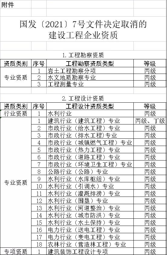附件:國(guó)發(fā)〔2021〕7號(hào)文件決定取消的建設(shè)工程企業(yè)資質(zhì)